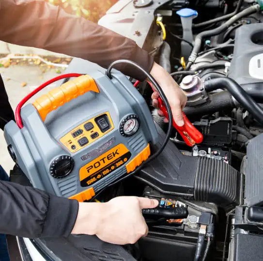 • [HIGH PERFORMANCE] POTEK 1500 Peak/750 Instant Amps Car Jump Starter,equipped with 18AH lead acid battery, an emergency life saver when you are out,perfect for long driving, camping, biking.